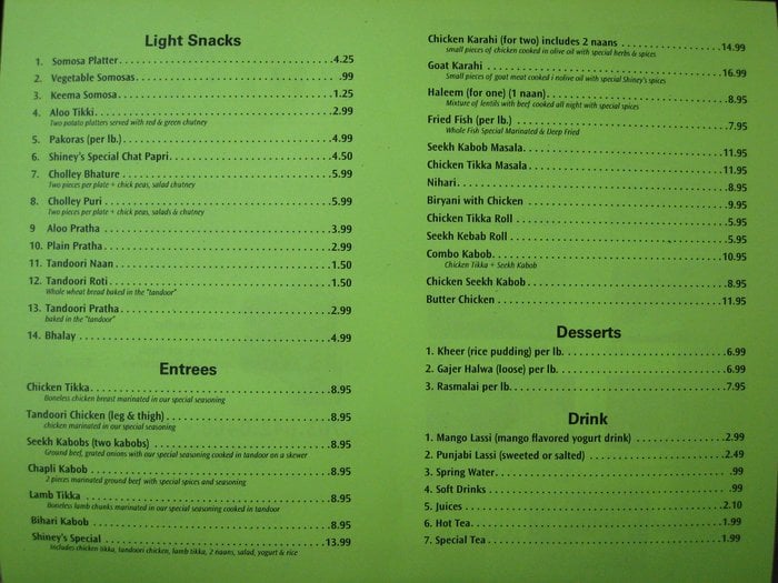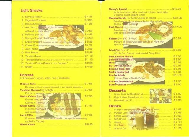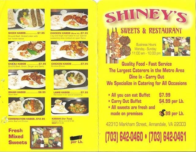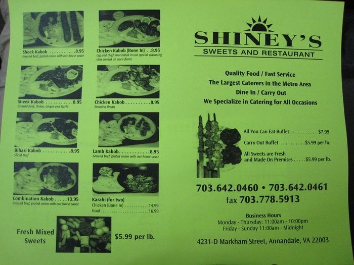 Introducing the menu at Shiney's Sweets & Restaurant, a hidden gem in Annandale, VA. This Pakistani eatery offers a range of authentic dishes like butter chicken, kabobs, halwa puri, and naan. Customers rave about the unlimited buffet for only $12, filled with samosas, chick peas, and flavorful chicken options. The friendly staff and cozy atmosphere make dining here a delightful experience. Don't miss out on the fresh sweets like mithaee and bakery pastries. The owner, who speaks multiple languages, adds a personal touch to the service. Whether you're a fan of Pakistani cuisine or looking for a new dining adventure, Shiney's is a must-visit spot for delicious food at unbeatable prices.